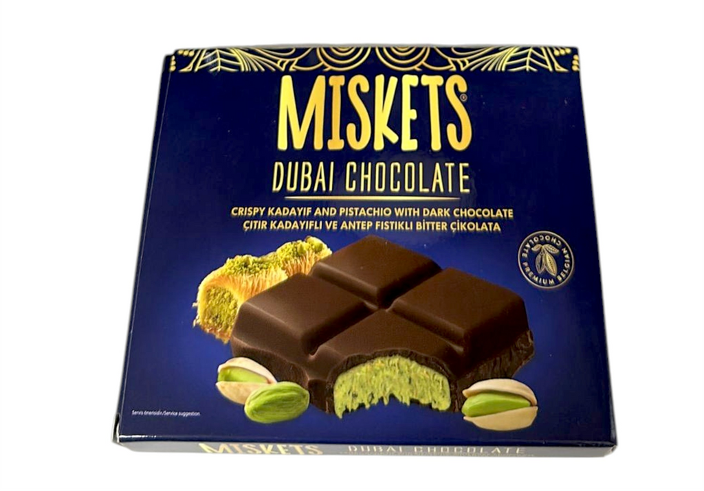 Disfruta el equilibrio perfecto entre la intensidad del chocolate oscuro y el toque distintivo del pistacho con Miskets Dark Dubai. Cada bocado combina una cobertura de cacao de gran calidad con el sabor característico del pistacho para una experiencia crujiente y cremosa a la vez.